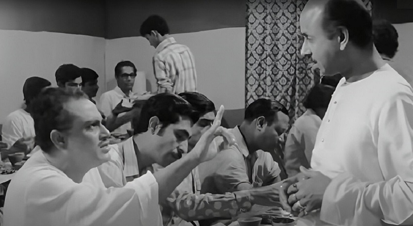 অতিথি ভদ্রলোক ‘আচ্ছা-আচ্ছা, ঠিক আছে,’ বলে অন্যত্র যেতেই সন্তোষ দত্ত চলে গেলেন হরেনবাবুর (কালী বন্দ্যোপাধ্যায়) কাছে। হরেনবাবু প্রতিবেশী, খেতে বসেছেন।
